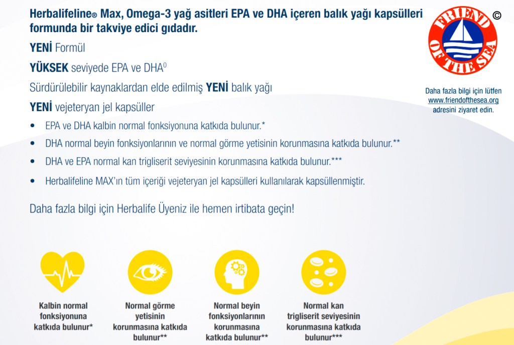 Herbalifeline® Max, sürdürülebilir kaynaklardan elde edilmiş, içerisinde iki esansiyel yağ asidi, Eikosapentaenoik asit (EPA) ve Dokosahekzaenoik asit (DHA) bulunan Omega-3 balık yağlarının bir karışımıdır.