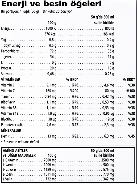 - 4 çorba kaşığı (50g) ürünü 500 ml suya karıştırın, kuvvetlice çalkalayın. Aerobik egzersiz sonrasındaki 30 dakika içerisinde tüketin.